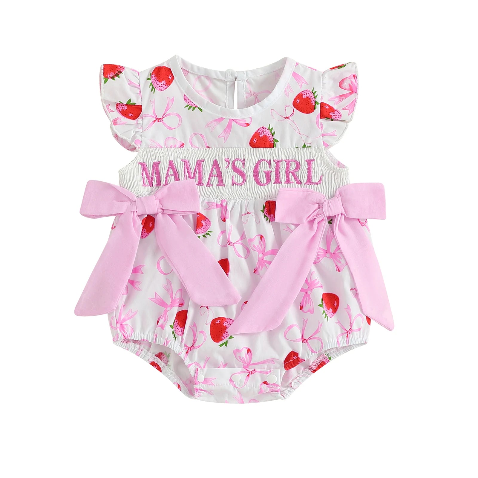 Add a burst of charm to your baby girl's summer wardrobe with this adorable strawberry print romper! Designed with soft, breathable cotton blend fabric, it features delicate letter embroidery, fluttering flying sleeves, and cute loose-fit bows. The smocked crew neckline offers a stretchy, comfy fit, making it perfect for playdates, Mother's Day celebrations, or just soaking up sunshine in style.