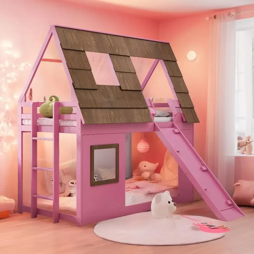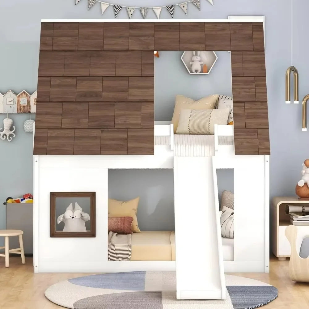 Transform your child’s bedroom into a playful and cozy retreat with this House-Shaped Twin Bunk Bed! Featuring a built-in slide, easy-access ladder, and charming roofed frame, this stylish bunk bed adds imaginative charm and practical function to any modern kid’s space.